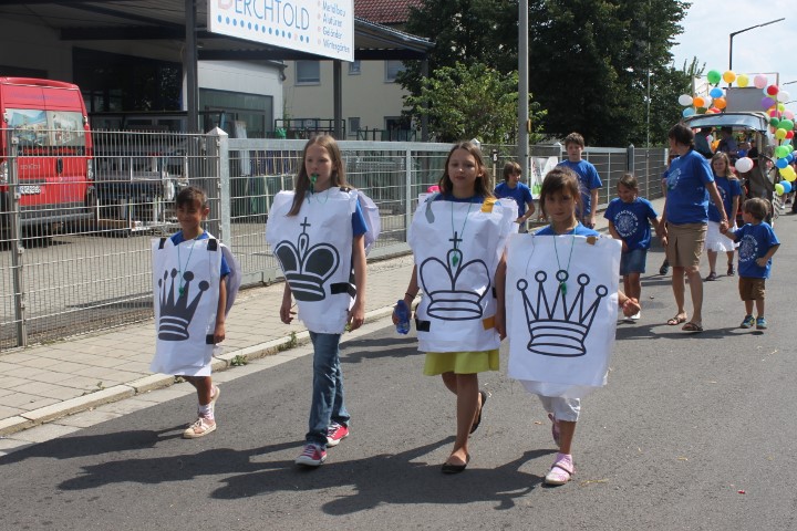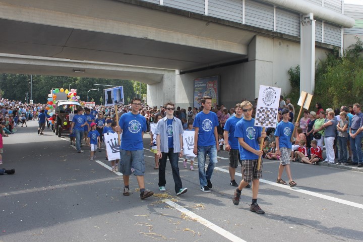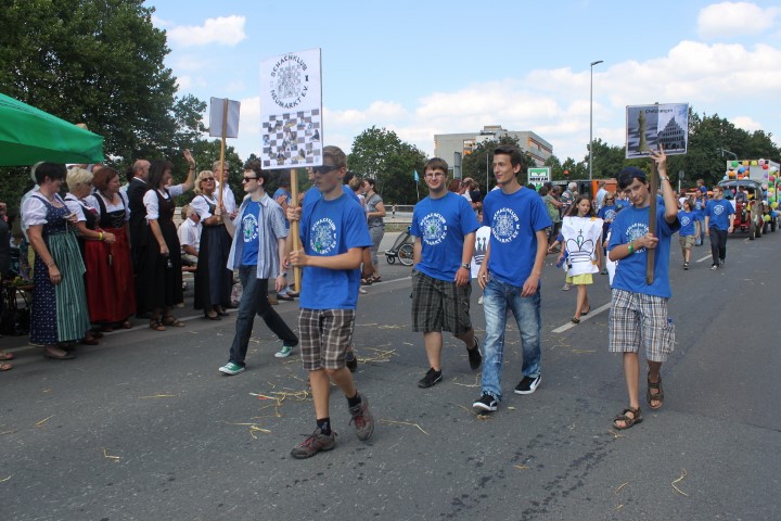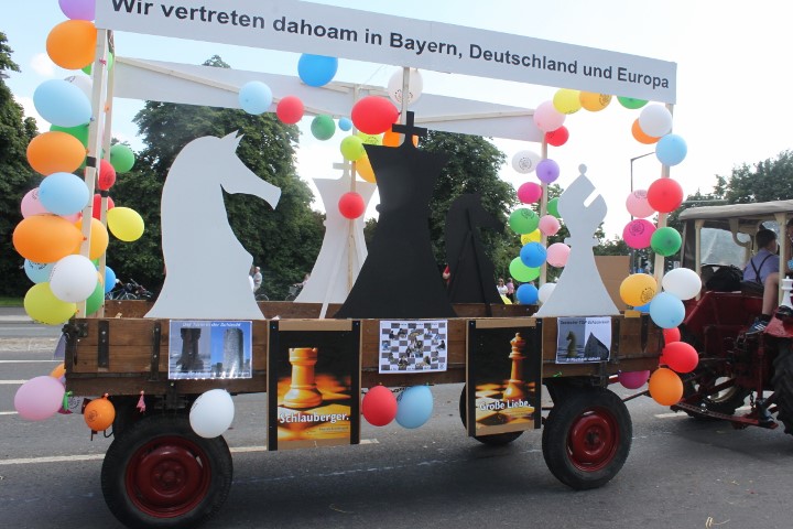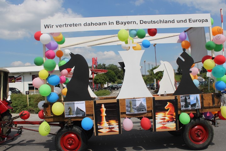 Am Sonntag fand der traditionelle Festumzug des Neumarkter Jura-Volksfests unter dem Motto „Neumarkt, da bin i dahoam!“ statt und auch der Schachklub Neumarkt war wieder mit von der Partie. Unser Festwagen war mit zahlreichen Schachmotiven geschmückt, dabei hatten wir erstmals je drei weiße und schwarze Figuren aus Holz mit einer Höhe von über 1m gebastelt.