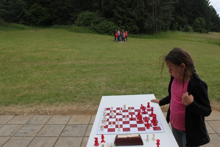 Um 8.30 Uhr wurde dann endlich gefrühstückt (mit super Apfel-Ofenknödel mit vom großen Pony 🙂 und danach bereiteten Mausebär und Ameisenbär das Räuberinnen-Schachturnier vor. Den Nicht-Schachspielerinnen erklärten die Vereinsmädchen die wichtigsten Schachregeln, so dass alle spielbereit waren und die „Räuberbretter“ freigegeben werden konnten. Um eine gerade Anzahl an Räuberinnen zu haben musste auch Flower-Power-Wölfin (Angelika) mitspielen. (Tinten-)Killer (Vinzenz) und die beiden Bären waren Turnierleiter). Spielmodus: 7 Runden Schweizer System mit 10 Minuten Bedenkzeit und durchrutschenden und nicht durchrutschenden Bauern :-). Gegen Mittag stand die Siegerin fest.