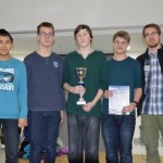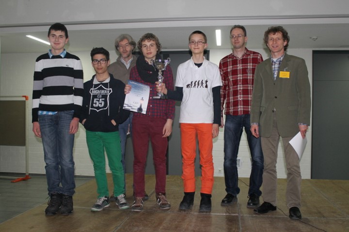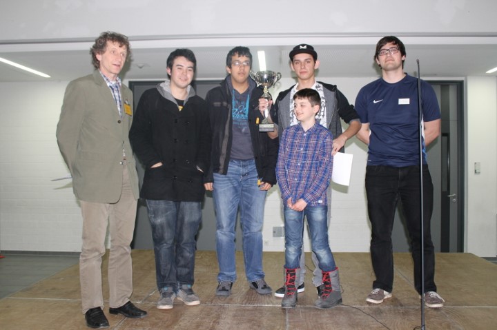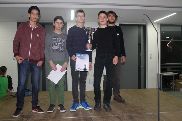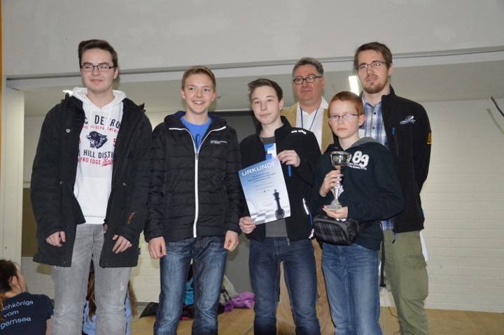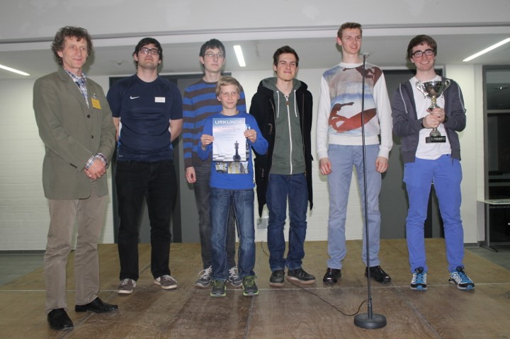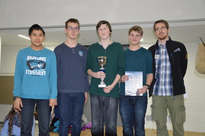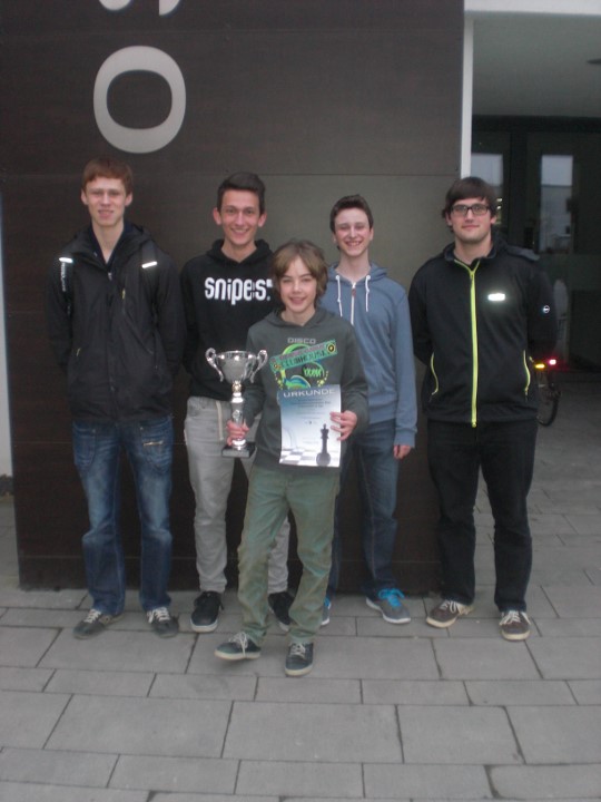 Das WGG legte in der letzten Runde mit einem 4:0 gegen das Johannes Turmaier Gymnasium vor und harrte nun der Dinge. Das Ohm-Gymnasium hatte mit dem Dalberg-Gymnasium einen schweren Brocken, setzte sich aber mit 2,5:1,5 durch. Das Gymnasium bei St.Stephan und das Goethe-Gymnasium kämpften im direkten Duell um den Titel, der Verlierer würde aber sogar das Podest verpassen. Letztlich entschied ein Dameneinsteller an Brett 1 zu Gunsten von St. Stephan, das sich mit 3:1 durchsetzen konnte. Damit lagen das Ohm-Gymnasium, St. Stephan und das WGG mit 15 Punkten in Front und während das WGG einen Brettpunkt Rückstand aufwies, lagen die beiden Anderen auch noch nach Brettpunkten gleichauf! Da aber das Ohm-Gymnasium den direkten Vergleich für sich entschieden hatte, sind Florian Dürr, Simon Wegmann, Marius Müller und Alexander Procelewski Bayerischer Meister.
