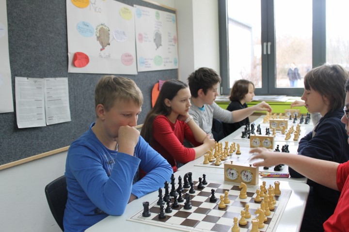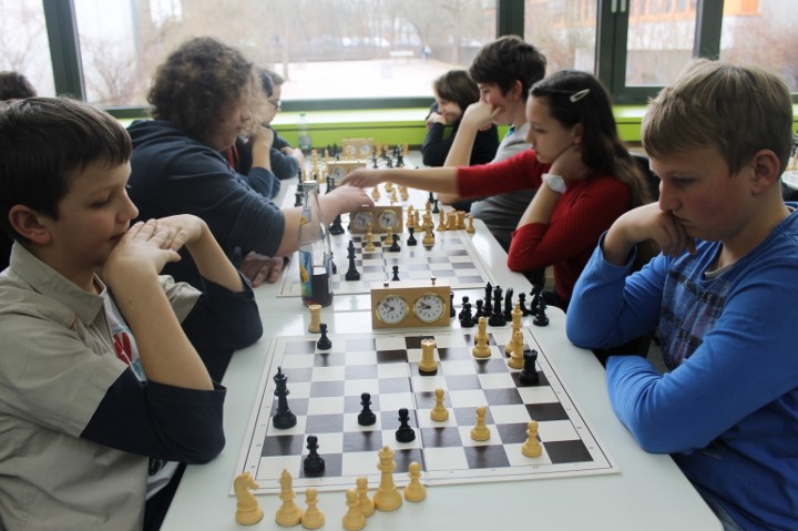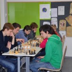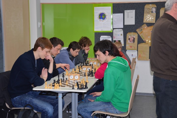 In den Runden sechs und sieben gab es das gleiche Bild: die Favoriten gaben sich keine Blöße und so marschierte das Gymnasium bei St.Stephan zwei Punkte vor dem Verfolgertrio Ohm-Gymnasium, Goethe-Gymnasium und WGG voraus. Doch in Runde acht spitze sich das Ganze weiter zu: das Ohm-Gymnasium stürzte den Spitzenreiter mit einem 3:1 Erfolg und da sowohl das Goethe-Gymnasium als auch das WGG jeweils 4:0 gewannan waren nun vier Teams punktgleich! Nach Brettpunkten hatte das Ohm-Gymnasium (25) kanpp die Nase vorn, dahinter lagen St. Stephan (24,5), das Goethe-Gymnasium (24) und das WGG (22,5) auf der Lauer.