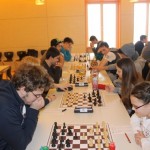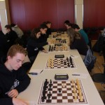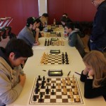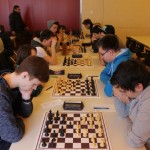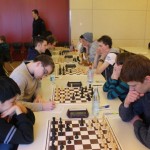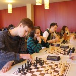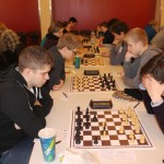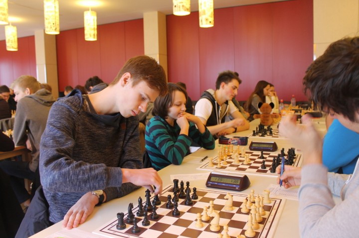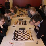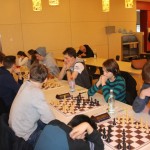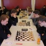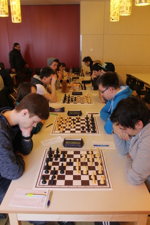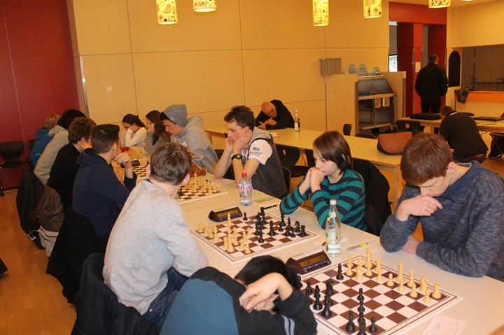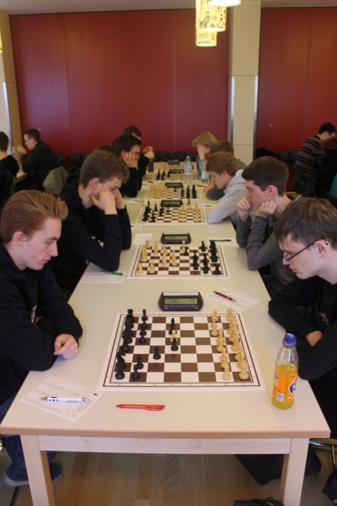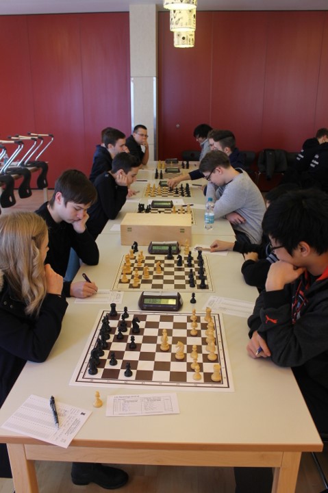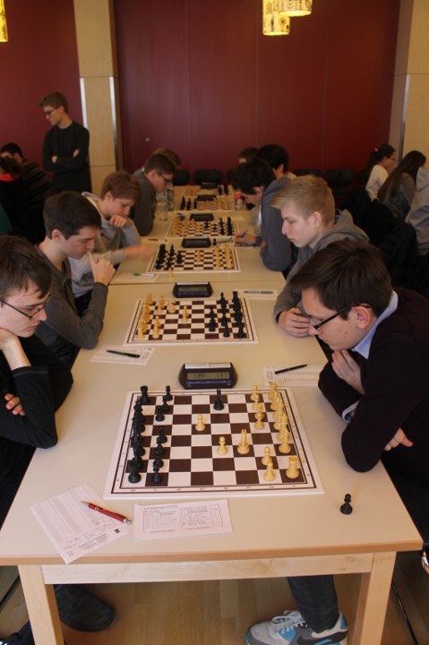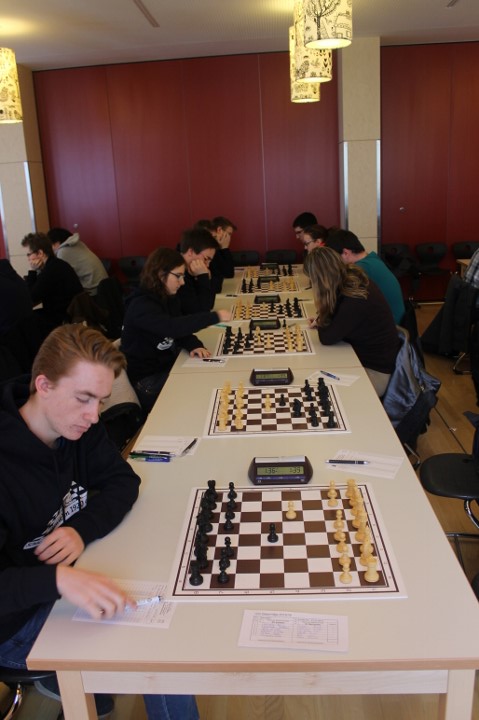 Für uns galt es nun für die Nachmittagsrunde die hohe Niederlage abzuschütteln, denn mit den Erlangern wartete schließlich der nächste schwere Brocken. Zwar traten sie ohne ihr Spitzenbrett an, waren aber natürlich immer noch klarer Favorit. Aber während wir gegen Forchheim früh aussichtslos in Rückstand geraten waren, boten wir den Erlangern einen packenden Kampf, dessen Ausgang lange in alle Richtungen offen war. Maria sah sich einem gefährlichen Königsangriff ausgesetzt und hätte eine Figur verlieren können. Nachdem ihr Gegenüber die beste Fortsetzung nicht fand kam sie unbeschadet mit gleichem Material heraus und hatte eigentlich die schwierigsten Klippen bereits umschifft. Doch dann hatte ihr Läufer kein Rückzugsfeld mehr und das Bauernopfer mit dem man die Figur hätte retten können sah sie erst in der Analyse… Yannick „durfte“ wieder gegen 600 DWZ-Unterschied spielen, machte seine Sache aber gut bis er nicht rechtzeitig aus einer Fesselung herauskam. Simon hatte eine vielversprechende Stellung mit einem Mehrbauern erreicht und schien auf einem guten Weg ehe die Partie doch noch kippte, was letztlich den Mannschaftskampf entschied. Zwar hatte Lorenz gegen Florian Dürr schon früh Quali und Bauer mehr und verwertete diesen Vorteil auch souverän, aber Maxi sah mit unter einer Minute für sieben Züge keine andere Möglichkeit als eine Zugwiederholung anzubieten. Danach nahm auch Eva in etwas besserer Stellung aber mit vier gegen neun Minuten ein Remisgebot zum 2:4 Endstand an.