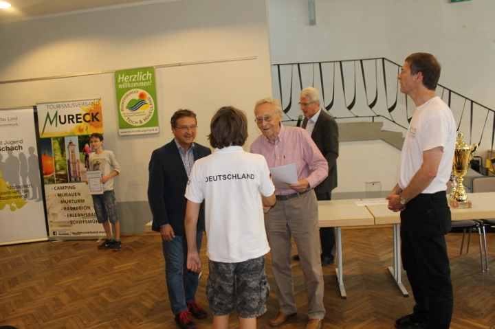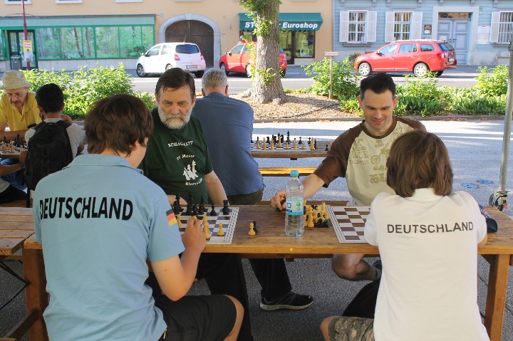 Die Fahrt ins 500 KM entfernte Mureck zog sich diesmal hin. Als dann das Ziel so langsam in greifbare Nähe gerückt war, bremste uns noch ein Stau bei Deutsch Feistritz aus. So trudelten wir erst nach rund sieben Stunden in Mureck ein. Nach einem kurzen Besuch bei Turnierdirektor Erich Gigerl ging es weiter nach Deutsch Goritz, wo wir wieder im Gasthof Bader untergebracht sind. Bis zum Abendessen trafen dann auch die anderen Mitglieder der deutschen Delegation ein: Maximilian Paul Mätzkow (ESV Eberswalde), der auch 2013 mit von der Partie war, sowie Lara und Lukas Schulze vom SK Lehrte – einer der wenigen Vereine in Deutschland, der wie wir beide Qualitätssiegel „Deutscher TOP-Schachverein“ im Bereich Kinder- und Jugendschach sowie Mädchen- und Frauenschach erhalten hat (Lehrte sogar schon zweimal). Max und Lara sind in der U14 an #2 und #3 gesetzt, Lukas in der U12 an #22. Als Delegationschef fungiert wieder Holger Borchers, uns allen noch in guter Erinnerung vom Trainingswochenende 2014 bei uns in Neumarkt.