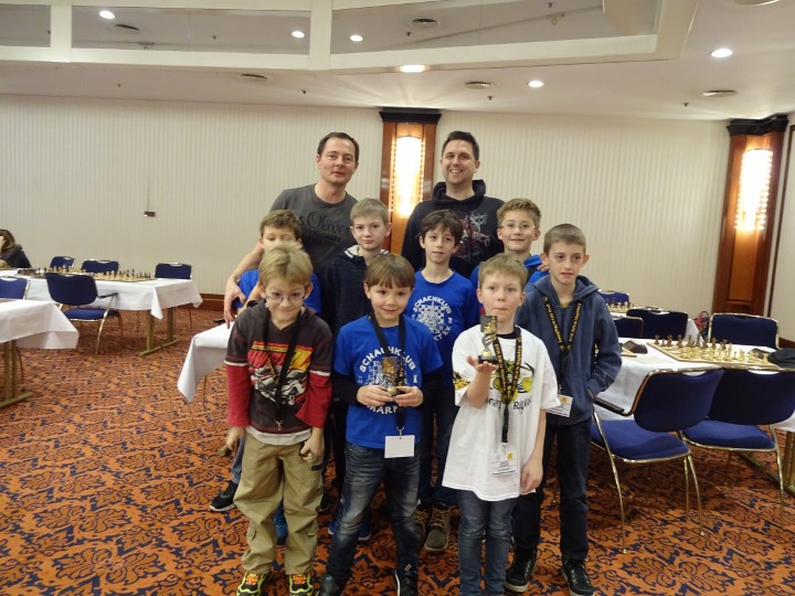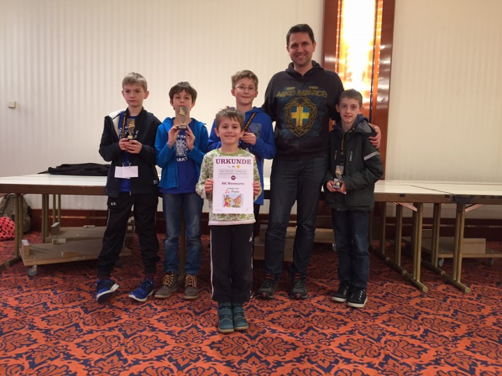 Unsere junge U10 Mannschaft – Vinzenz Schilay (7), Leonhard Franke (7), Andreas Hierl (8) und Simon Thieme (8) – konnte in Magdeburg wieder viel Erfahrung sammeln. Einen Sieg und zwei Unentschieden hatte man letztlich auf der Habenseite, womit man auf dem Setzlistenplatz 56 landete. Damit war man hinter dem Lübecker SV II (5 Punkte) zweitbestes U8-Team im Feld.