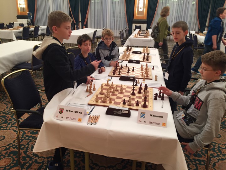 Den erwartet schweren Stand hatte die Neumarkter U12-Mannschaft bestehend aus Josef Franke, Daniel Henseler, Sebastian Henseler und Christoph Reger. Schon die Qualifikation für das Bayerische Finale war ein Riesenerfolg und nun musste man noch auf Maria Schilay und Denis Dechand verzichten. Obendrein ging Daniel gesundheitlich angeschlagen ins Turnier. So befand sich das Team mit einigem Abstand am Ende der Setzliste und realistisch gesehen lagen nur zwei andere Mannschaften in Reichweite. Trotzdem hielt man in vielen Partien gut mit, insbesondere Daniel kosteten meist erst Ungenauigkeiten im Endspiel den ein oder anderen Punkt. Aber auf diesem Niveau werden Fehler halt gnadenlos bestraft und so standen am Ende doch sieben Niederlagen zu Buche.
