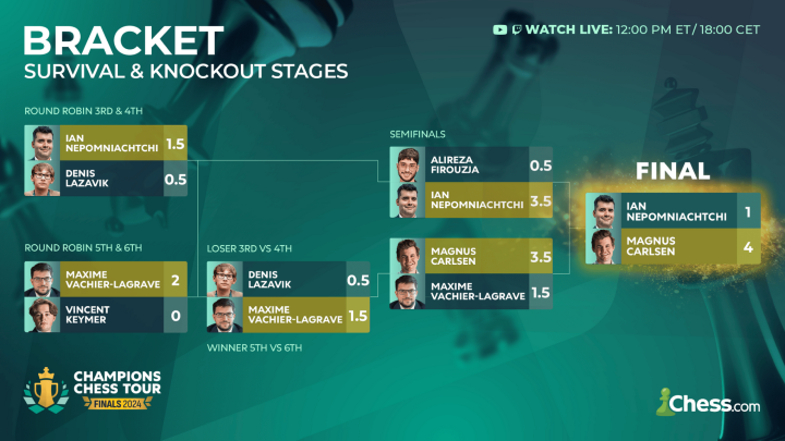 Gegen Maxime Vachier-Lagrave hatte Keymer das Nachsehen und wurde somit Sechster. Das Finale gewann Carlsen klar mit 4:1 gegen Ian Nepomniachtchi.