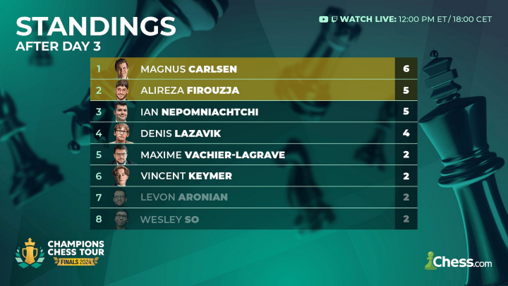 Vom 17. – 21. Dezember findet das Finale der besten acht Spieler der Champions Chess Tour 2024 in Oslo statt. Die ersten drei Tage spielt jeder gegen jeden, wobei die besten Zwei sich für das Halbfinal qualifizieren. Die Spieler auf den Rängen drei bis sechs spielen die anderen beiden Halbfinalisten aus. Gespielt wird im Modus 10+2, Spielbeginn ist jeweils um 17h.